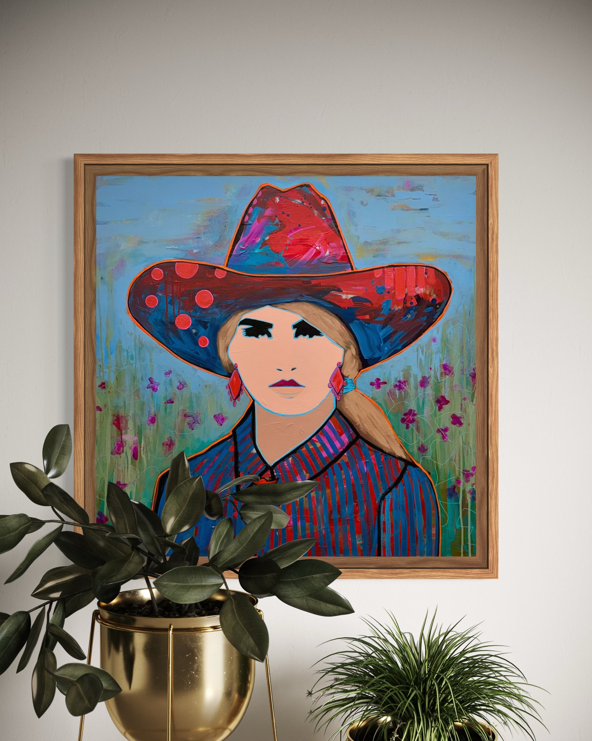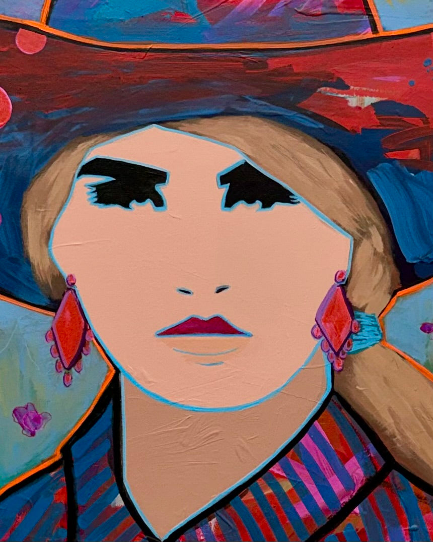 36" x 36", Acrylic on canvas. Unframed. My cowgirls are part of my "American Girl" series. They are born of lots of layers of color which contributes to the beautiful variations of color and shape in their hats and clothes. This layering will leaves texture and some texture can generally be found on the face.